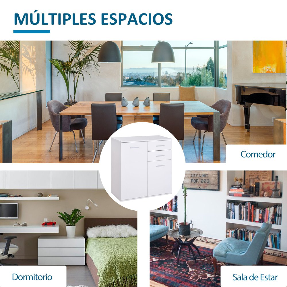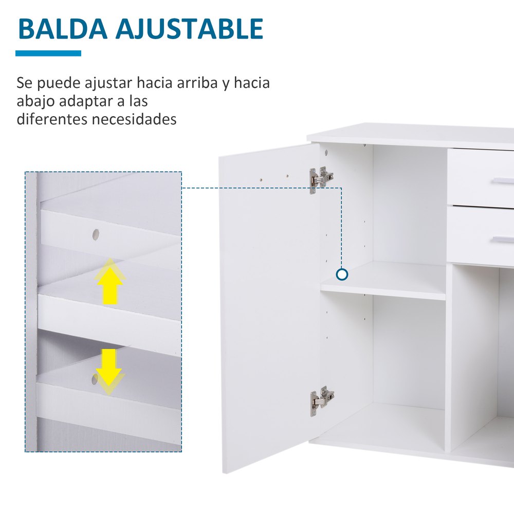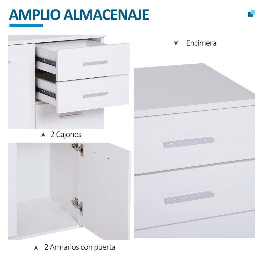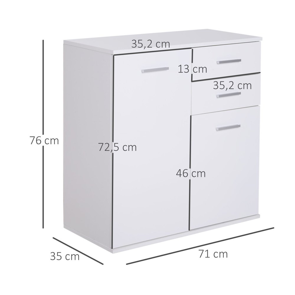 ¡Añade ese espacio extra que tanto necesitas! Con este armario de HOMCOM tendrás ese espacio que te falta.Su diseño elegante lo hace compatible con cualquier tipo de decoración.Consta de 2 cajones y 2 armarios con puertas.El armario izquierdo incorpora un estante de altura ajustable; para adaptarse a tus necesidades.Proporciona un amplio espacio de almacenamiento.¡A qué esperas para organizar tu hogar!Características:- Diseño contemporáneo de color blanco brillante.- Perfecto para oficinas; salas de estar; comedores y habitaciones.- Consta de 2 cajones y 2 armarios.- Estante de altura ajustable en el armario izquierdo.- Estructura de tablero de partículas.Muy resistente y duradero.Fácil de limpiar.- Requiere montaje.Especificaciones:- Color:blanco.- Material:tablero de partículas.- Medidas totales:71x35x76 cm (LxANxAL).- Medidas de la puerta del armario izquierdo:35;2×72;5 cm (LxAL).- Medidas del balda ajustable interior:33×33 cm (LxAN).- Medidas interiores del cajón:27;8×28;8×7;7 cm (LxANxAL).- Medidas interiores del armario derecho:33x33x45;5 cm (LxANxAL).- Capacidad máxima de carga:(total) 50 kg; (cajón) 10 kg; (balda) 20 kg.- Referencia:837-002.