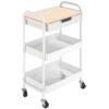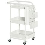 Un carrito verdulero es una herramienta fantástica para organizar tu espacio en casa o en el trabajo. Este carro con ruedas y barra de empuje de HOMCOM cuenta con 3 cestas espaciosas de rejillas para que puedas tener tus documentos ordenados; o las toallas en el lavabo o las frutas en la cocina. Gracias a su panel lateral con ganchos y 2 cubos; puede personalizarlo y adaptarlo a tu estilo y necesidades. Además; tiene ruedas para que puedas moverla de un sitio a otro fácilmente. Características – Carrito de almacenaje ideal para usar en la cocina; junto al escritorio; en el baño; la oficina y más – Su diseño de 3 niveles ofrece un amplio para los suministros y accesorios – Las cestas de alambre permiten que el aire circule; lo que es perfecto para almacenar verduras; frutas y ropa doblada – El panel lateral con 4 ganchos extraíbles; y 2 tamaños de cubos organizadores proporcionan soluciones de almacenamiento creativas – Dispone de 4 ruedas; 2 de ellas con freno para facilitar el transporte de un espacio a otro – Fabricado con estructura de metal y ruedas de plástico PP para mayor estabilidad y robustez – Requiere montaje Especificaciones – Color: blanco – Material: metal y plástico PP – Medidas totales: 51;5x32x75;6 cm (LxANxAL) – Medidas de la cesta arriba: 38;6×27;2×4 cm (LxANxAL) – Medidas de la cesta centro: 39;6×28;2×6;5 cm (LxANxAL) – Medidas de la cesta abajo: 40;6×29;2×7 cm (LxANxAL) – Carga máxima: 11;3 kg (total); 3 kg (cada cesta); 1 kg (cubo grande) y 0;5 kg (cubo pequeño) – Referencia: 850-185WT