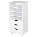 Si quieres mantener tu zona de despacho en orden; este mueble auxiliar de oficina de Vinsetto te va a encantar.Podrás colocar en él todo el material de oficina; cuadernos; etc.que utilices o si lo prefieres lo puedes destinar como cajonera para manualidades y guardar en él todo el material que necesitas para tus creaciones.Este mueble auxiliar de oficina es perfecto tanto para utilizar en casa como en la oficina.No lo dudes y organiza los materiales de tu trabajo diario para no perder tiempo buscando la grapadora; los clips o tu bloc de notas que nunca sabes donde dejas.¡La opción perfecta para ganarle minutos al día!.Características:- El mueble auxiliar perfecto para mantener material de oficina bien organizado tanto en el despacho en casa como en la oficina.- Fabricado con tablero de partículas de grado E1.- Amplio espacio de almacenaje para diferentes tipos de objetos; desde papel a material de escritura o; pequeños aparatos de uso diario en el despacho:como grapadoras; clips; etc.- 4 ruedas perfectas para mover el mueble con comodidad.- Fácil de limpiar pasando un paño húmedo.- Requiere montaje.Especificaciones:- Color:blanco.- Material:tablero de partículas.- Medidas totales:40x30x83 cm (LxANxAL).- Medidas de cada estante abierto:37;5x30x9 cm (LxANxAL).- Medidas internas de cada cajón:35×23;5×7 cm.- Carga máxima:21 kg (total); 2;5 kg (cada estante).- Referencia:924-010.